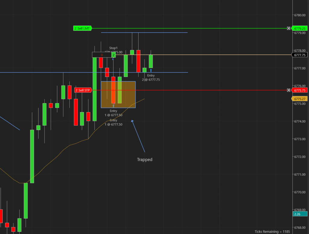 I want you to look at my take profit on this trade. It proves my theory about how the market traps everyone. Exactly 1 tick above the previous high, before the price pulls away from the area, trapping these traders.