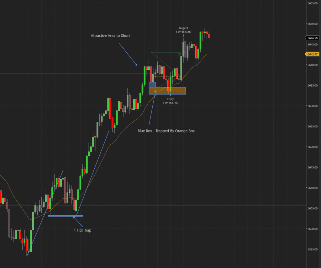 I waited and followed the market, searching for an opportunity. Here, you’ll notice the “1 tick trap,” where the price pushed up, retested the previous support, and stopped out any early buyers.
